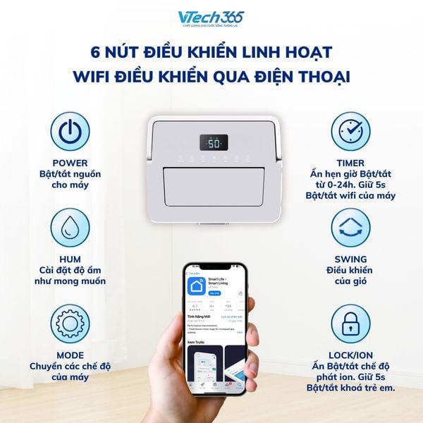 Một trong những điểm khác biệt lớn nhất của VT-HA350-W là khả năng kết nối wifi và điều khiển qua App điện thoại, cho phép người dùng kiểm soát độ ẩm, cài đặt chế độ hoạt động, hẹn giờ bật tắt thiết bị từ xa – vô cùng tiện lợi cho các gia đình hiện đại hoặc người đi làm thường xuyên vắng nhà.